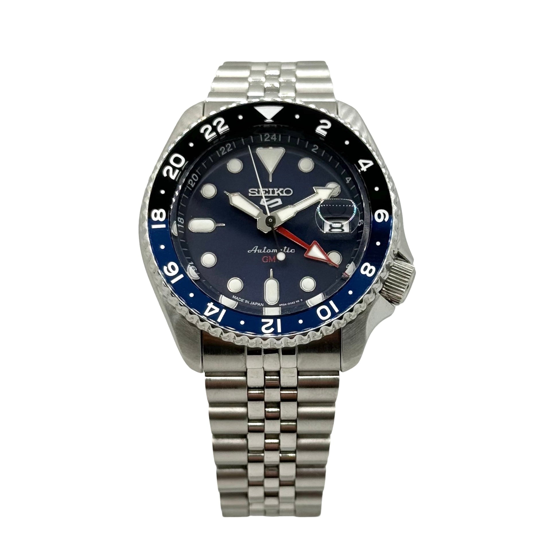 Seiko 5 Sports SKX Sports Style GMT Series Design of the case and bracelet inspired by one of Seiko's best-loved sports watches, known to enthusiasts as the Seiko SKX series Automatic GMT with manual winding capability. Blue and black 24-hour GMT bezel Blue dial. Magnified date calendar Luminous hands and markers. Large GMT hand for improved visibility and legibility. Screwdown see-through caseback. Tri-fold push button release clasp with lock.