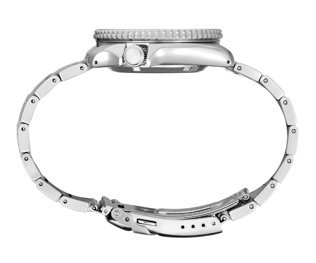 Seiko 5 Sports Collection. A tribute to Seiko’s iconic “Time Sonar” of the 1970s, this exceptional watch features a distinctive translucent turquoise dial offering a view of the day-date disk. Framed by a bi-color uni-directional rotating bezel, the dial also features bold luminous hands and markers, and a contrasting seconds hand accent. Providing automatic technology that you control with every movement, this dynamic timepiece is powered by a 24-jewel movement that beats at a frequency of 21,600 vibrations per hour, with a power reserve of approximately 41 hours and manual winding capability, visible through the screwdown see-through caseback. Crafted of stainless steel with a locking tri-fold push button release clasp. 10 bar, 100M Water Resistant.