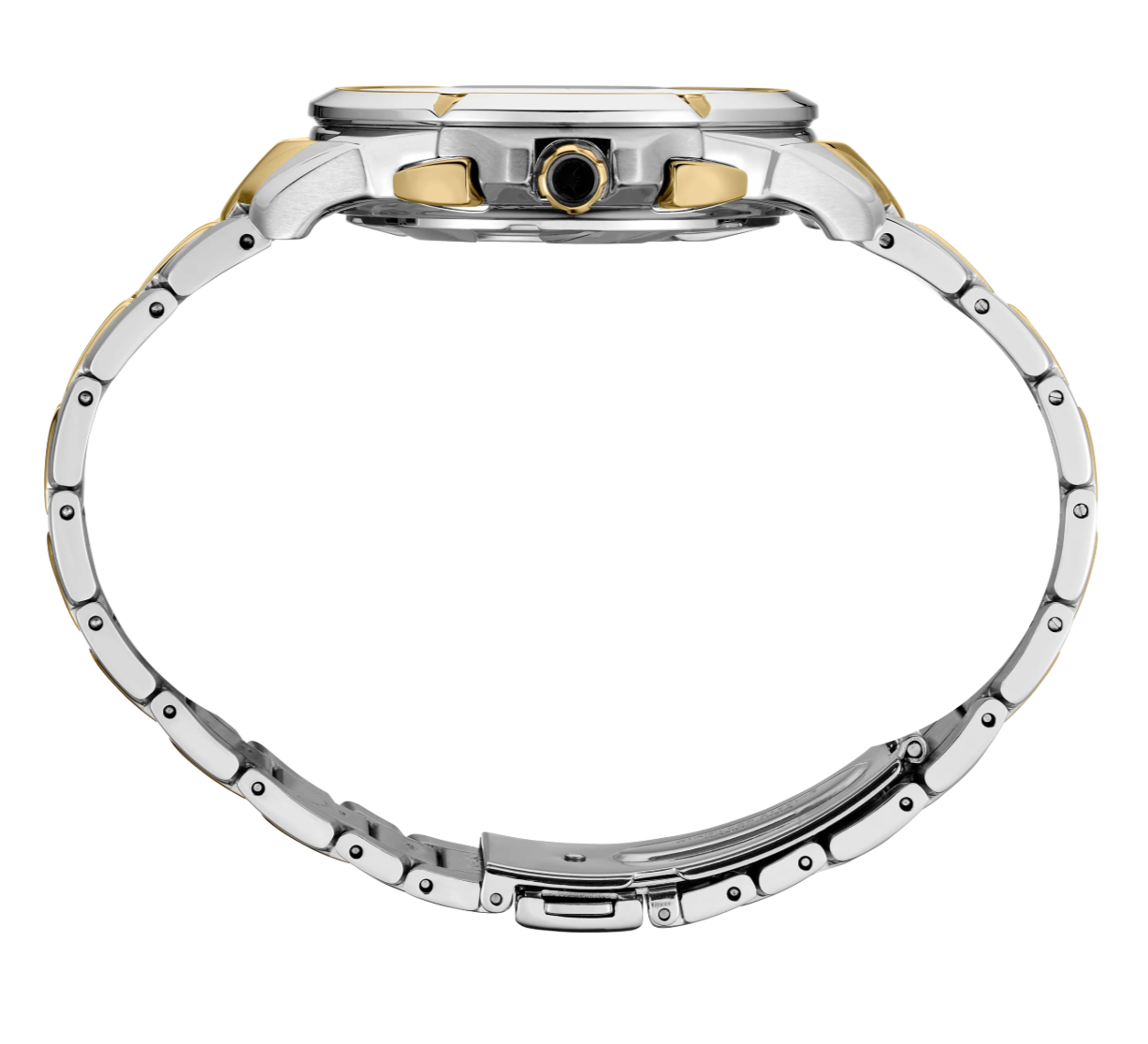 From the Coutura Collection. Delivering the perfect blend of technology and design for those on the move, the Coutura Collection combines bold angularity and shading with superior timekeeping for effortless sport/dress style. Inspired by motor sports, with a new case and bracelet design incorporating the angles and edges of racecar architecture, this dashingly sculpted chronograph features a multi-layer carbon-fiber patterned black dial styled to suggest a dashboard, with prominent 24-hour and chronograph minute subdials at 3 and 9 o’clock, tachymeter outer ring, date calendar, red chronograph hand, and LumiBrite hands and markers. Applied markers and subdial rings add a rich dimensionality, while the gold accents punctuating the bezel provide a sense of propulsive action. Crafted of stainless steel in a rich two-tone finish, this dynamic watch includes a sapphire crystal, screwdown caseback, tri-fold push button release clasp and classic cabochon crown. The chronograph function offers timing to 60 minutes in 1/5-second increments with split time measurement. 10 bar, 100M Water Resistant