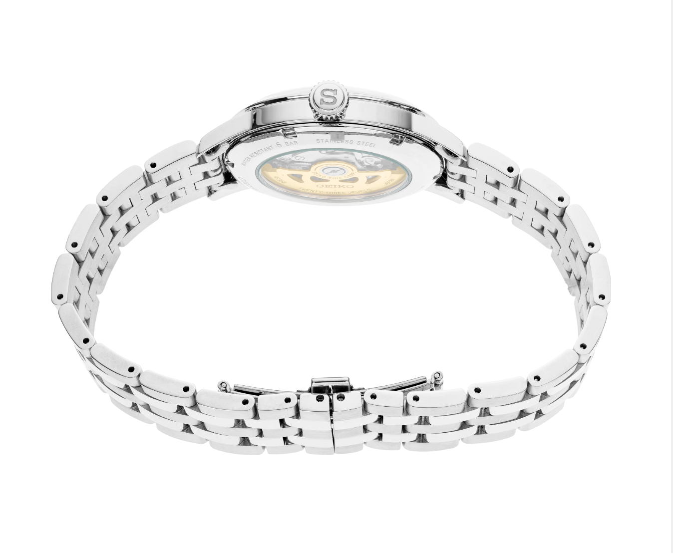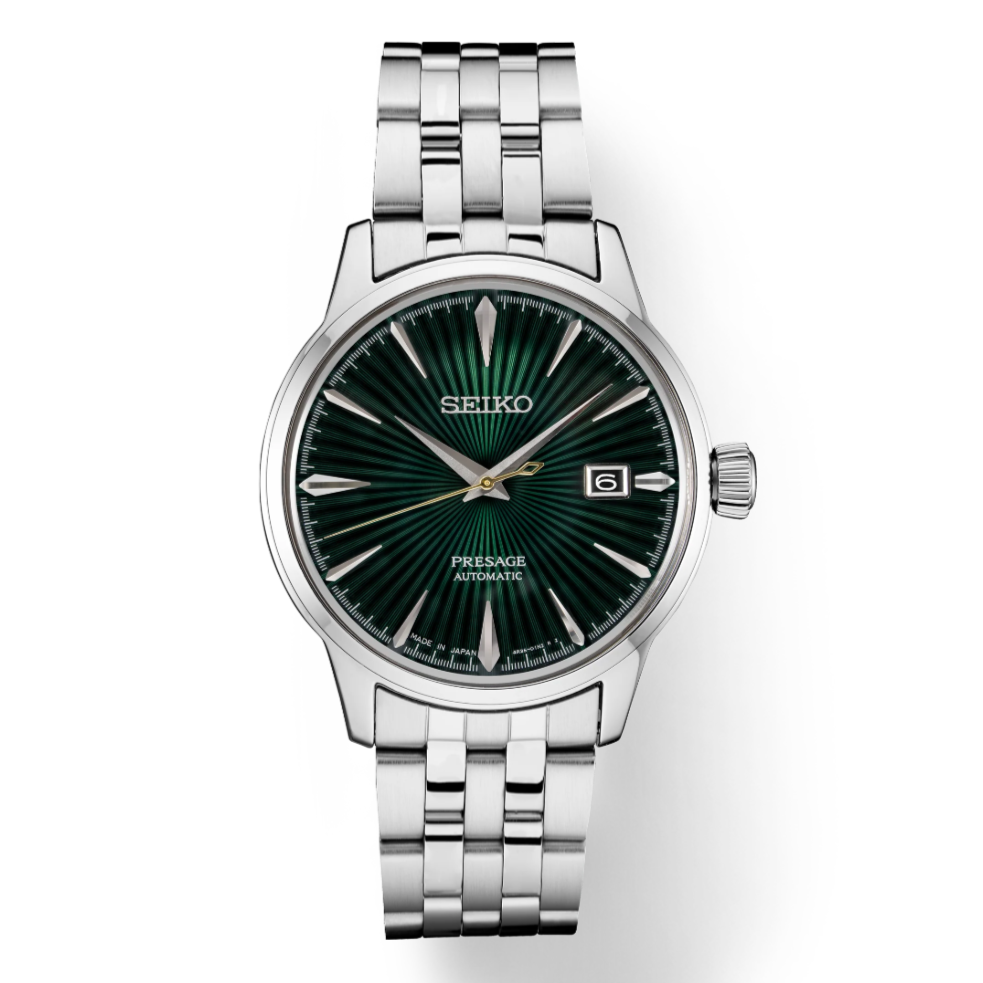 From the Presage Cocktail Time Collection. Offering the finest in Japanese mechanical watchmaking, the Presage Collection blends precision technology with superior craftsmanship and design. Inspired by the delights of a cocktail bar, this sophisticated watch features a green dial with pressed pattern, gloss finish and date calendar. The 23-jewel movement, with manual and automatic winding capability, beats at a frequency of 21,600 vibrations per hour, with a power reserve of approximately 41 hours. Crafted of stainless steel, this elegant timepiece includes a box-shaped crystal, screwdown see-through caseback, and double deployment clasp with push button release. 5 bar, 50M Water Resistant