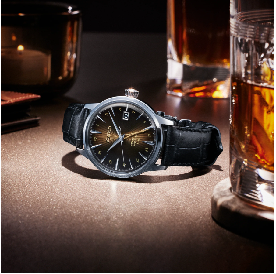 Presage Cocktail Time GMT. Offering the finest in Japanese mechanical watchmaking, the Presage Collection blends precision technology with superior craftsmanship and design. Inspired by the vibrance of the city’s modern lounges, the newest Cocktail Time designs express the excitement of today’s Tokyo, with fresh styling and colors. Evoking the Rusty Nail cocktail, the dark brown gradated dial features a deep pressed pattern with a lustrous gloss finish accented with a gold-tone GMT hand designed in the shape of a cocktail glass, while beautifully displaying a cursive-style Arabic numeral 24-hour scale. The 24-jewel automatic GMT movement, visible through the screwdown see-through caseback, beats at a frequency of 21,600 vibrations per hour with a power reserve of approximately 41 hours. Crafted of stainless steel and paired with a black leather strap, this distinctive timepiece includes a date calendar, box-shaped crystal, and tri-fold clasp with push button release. 5 bar, 50M Water Resistant