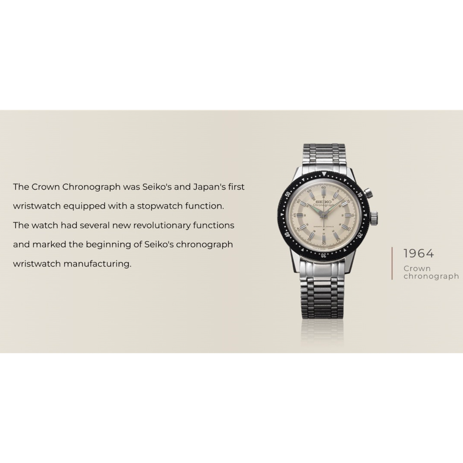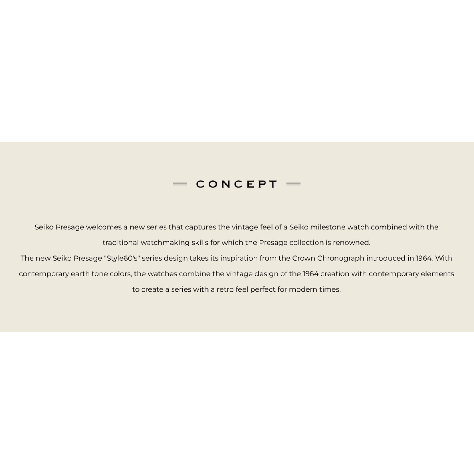 The new Seiko Presage "Style60's" series design takes its inspiration from the Crown Chronograph introduced in 1964. With contemporary earth tone colors, the watches combine the vintage design of the 1964 creation with contemporary elements to create a series with a retro feel perfect for modern times.