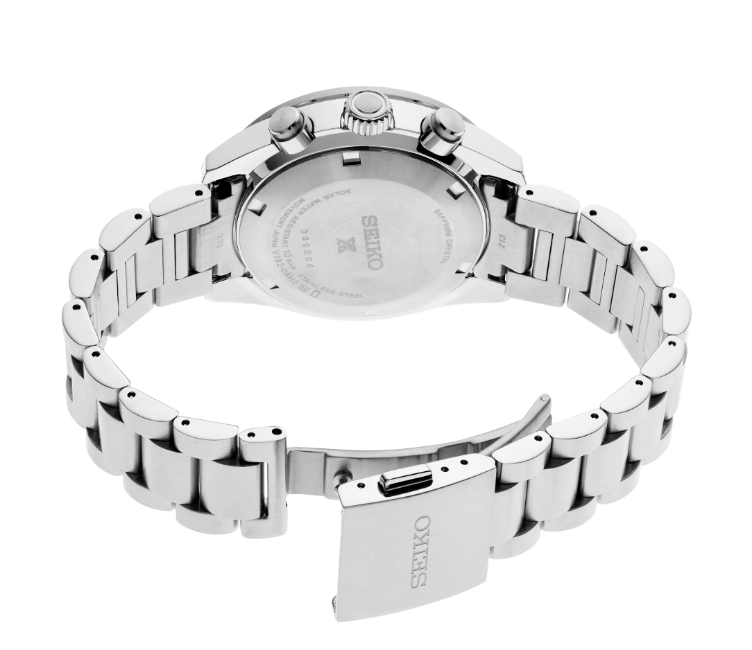 Prospex Speedtimer Solar Chronograph. Designed for those who treat life as the ultimate adventure, Seiko Prospex keeps moving forward, meeting every challenge with technological excellence and winning design. This rugged and stylish watch is part of a high-intensity collection inspired by the 1969 “Speedtimer,” the world’s first self-winding chronograph. This exceptional timepiece offers an enhanced emphasis on usability, legibility and visibility by adding LumiBrite hands and markers, a slightly larger case size and a tapered three-link bracelet. The chronograph function measures up to 60 minutes of elapsed time in 1/5-second increments and includes a split time function, while the solar cell, powered by any light source, with no battery change required, provides a 6-month power reserve when fully charged. Framed by a black tachymeter bezel, the pale blue dial with a brilliant sunray finish features three black subdials, with 24-hour and power reserve indicators, as well as a date calendar and LumiBrite hands and markers. Crafted of stainless steel, with a curved anti-reflective sapphire crystal, this timepiece includes a secure screwdown caseback and tri-fold push button release clasp. 10 bar, 100M Water Resistant