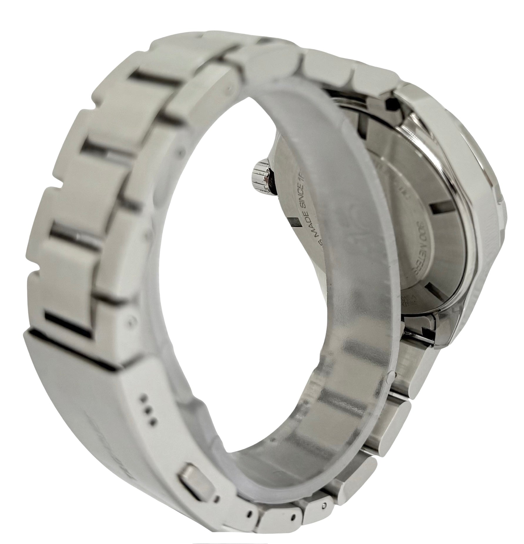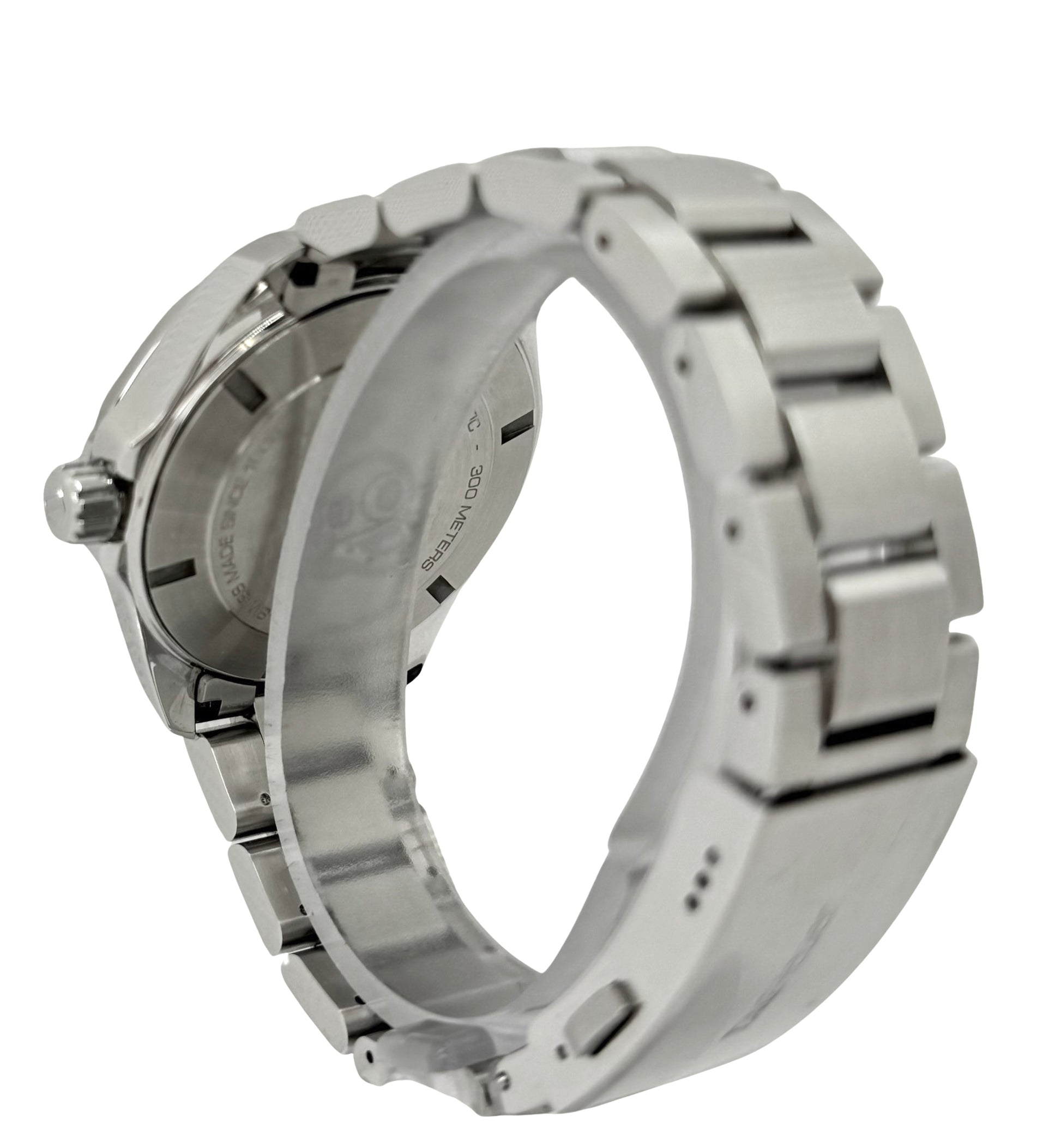 A Calibre 7 GMT powered Aquaracer with an expansive 43mm case and a two-color GMT function bezel for additional time zones. The dial’s distinctive horizontal streak effect and special luminescence markers on the hands and indexes make reading easy in dim light or under water.