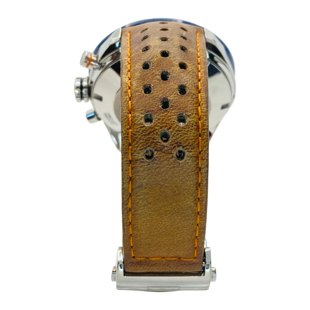 A combination of sunray blue dial, polished and brushed steel case and perforated brown leather gives this chronograph a gentleman driver appeal. The detailing on the classic 6-9-12 chronograph dial echo its roots in motor-racing and sportscar design.