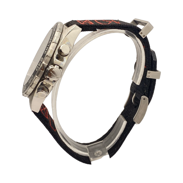 A boldly masculine racing chronograph with black aluminium tachymeter-scale bezel and an opalescent black dial with red and black details and the iconic red and green TAG Heuer shield.