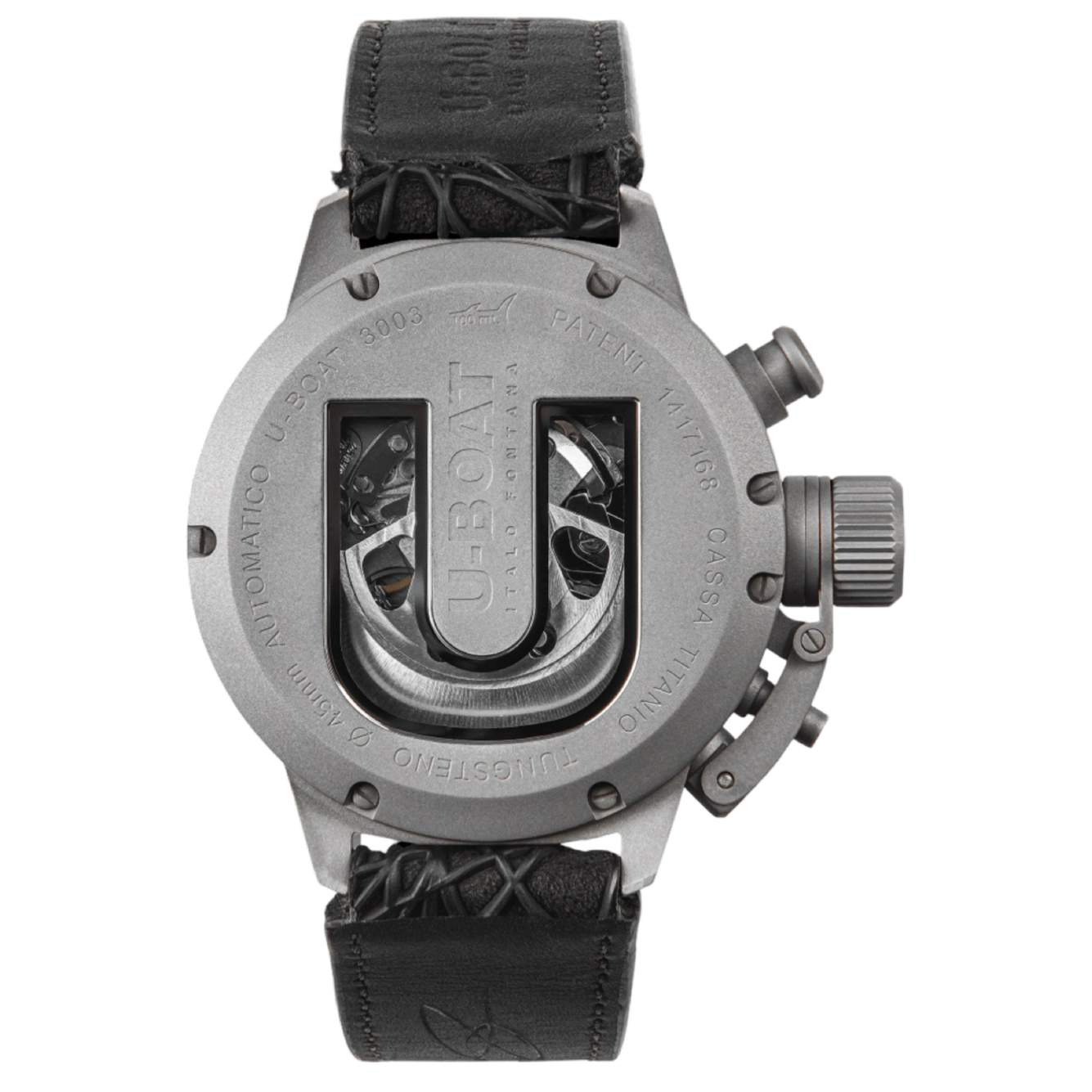 mechanical automatic chronograph movement with technical modifications to U-BOAT specifications. Frequency 28,800 vibrations/hour, 4 Hz. Power reserve 62 hours. 25 jewels. Skeletonized rotor. SW 500 Sellita.