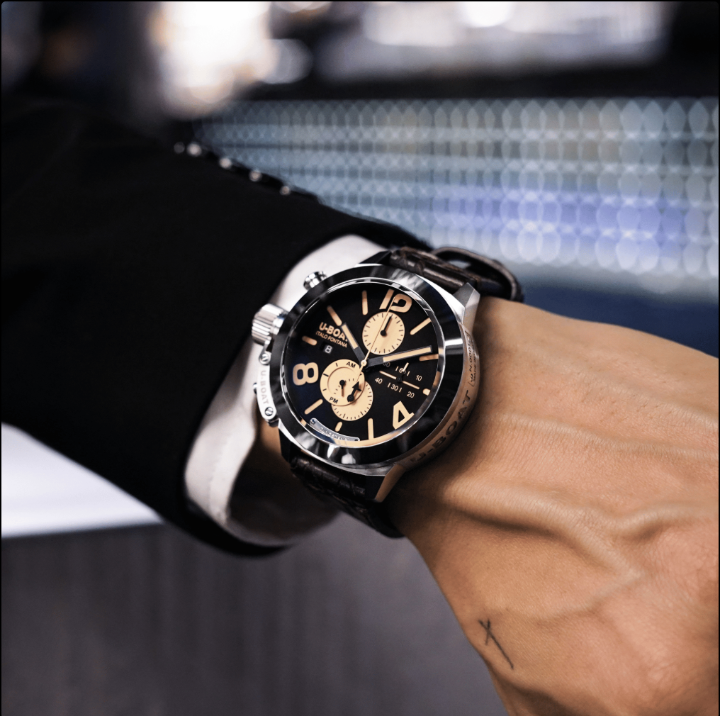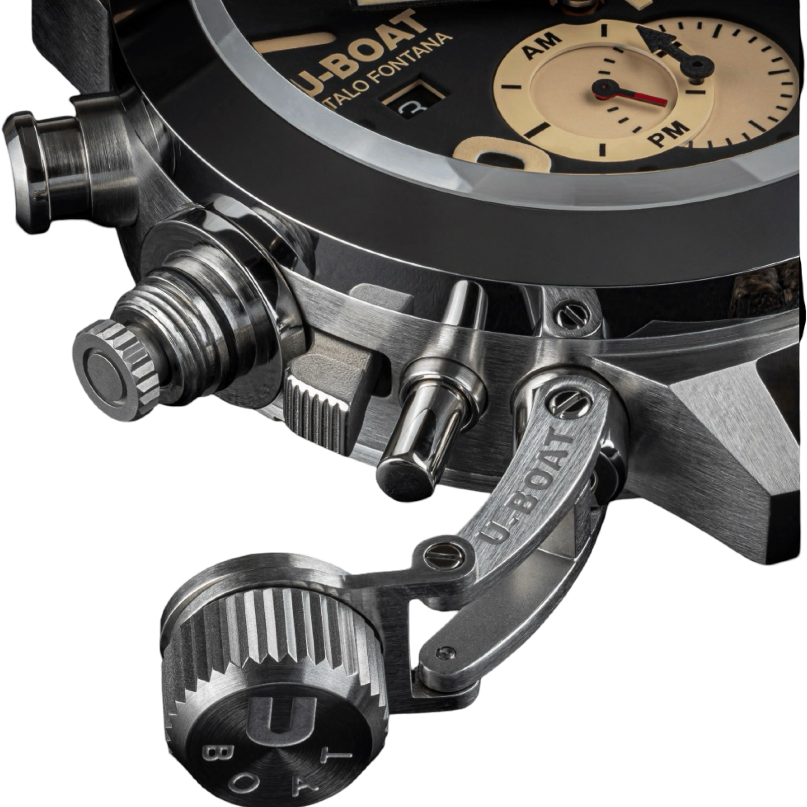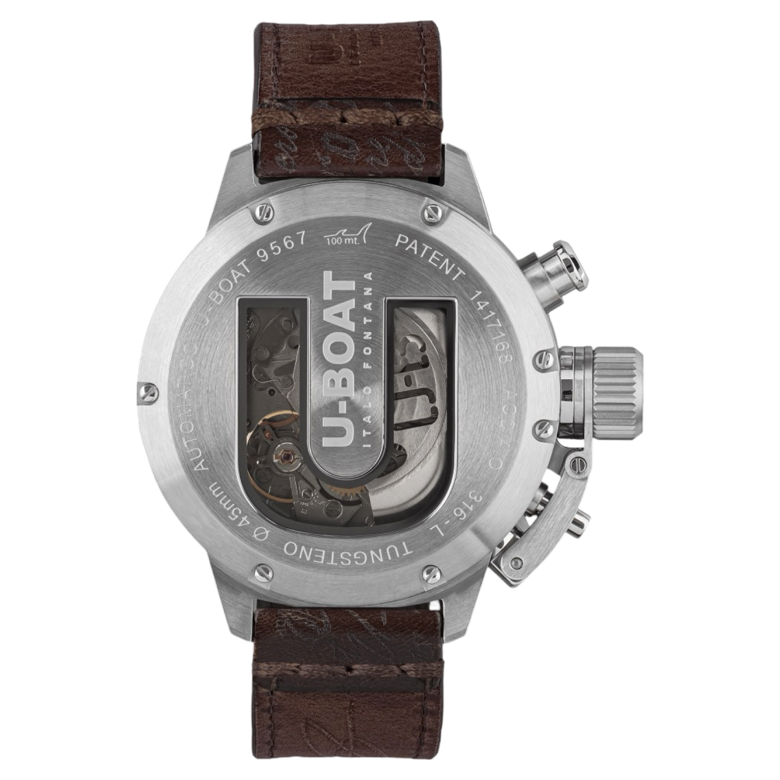 Sellita SW 500 mechanical automatic chronograph, with technical modifications to U-BOAT specifications. Frequency 28,800 vibrations/hour, 4 Hz. Power reserve 62 hours. 25 jewels. Skeletonized rotor.