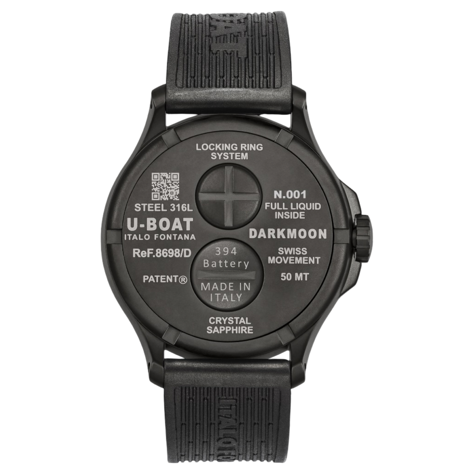 stainless steel AISI 316L, with PVD treatment, completely filled with a special oil that emphasizes the dial, creating the illusion of the absence of glass, and an optical effect of a more intense colour and higher legibility. Visible air bubble on the dial to compensate the temperature variations. Distinguishing crown on left side. Diameter 44,80 mm.