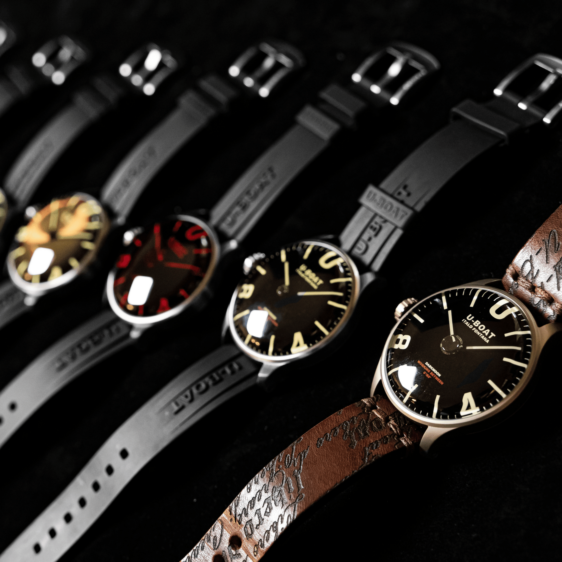 stainless steel AISI 316L, completely filled with a special oil that emphasizes the dial, creating the illusion of the absence of glass, and an optical effect of a more intense black and higher legibility. Visible air bubble on the dial to compensate the temperature variations. Distinguishing crown on left side. Diameter 44,80 mm.