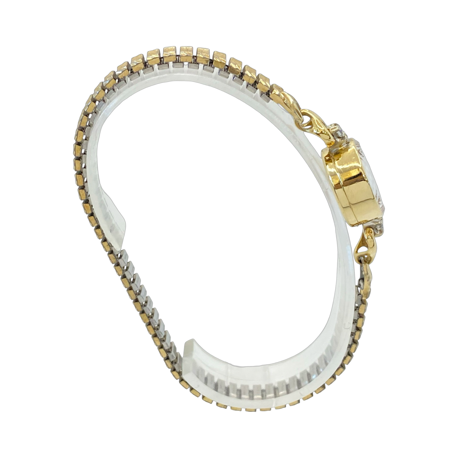 Condition: Good pre-owned condition, shows signs of wear, personal engraving on the caseback. The watch is known for its opulent design, often featuring precious metals and gems. The watch's band is a two-tone expansion style with yellow gold-colored links. This timepiece is a unique vintage piece. Fits up to 7.5" wrist