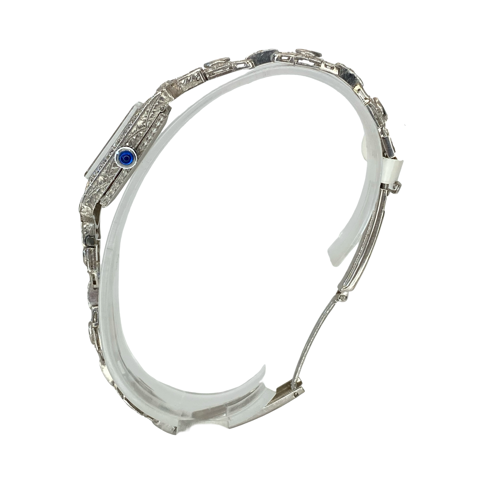 This watch is a vintage Art Deco-style ladies' watch, featuring a rectangular case and bracelet made of platinum and set with diamonds. The watch crown is a small blue cabochon, likely a sapphire. This style of watch was popular in the 1920s and 1930s.